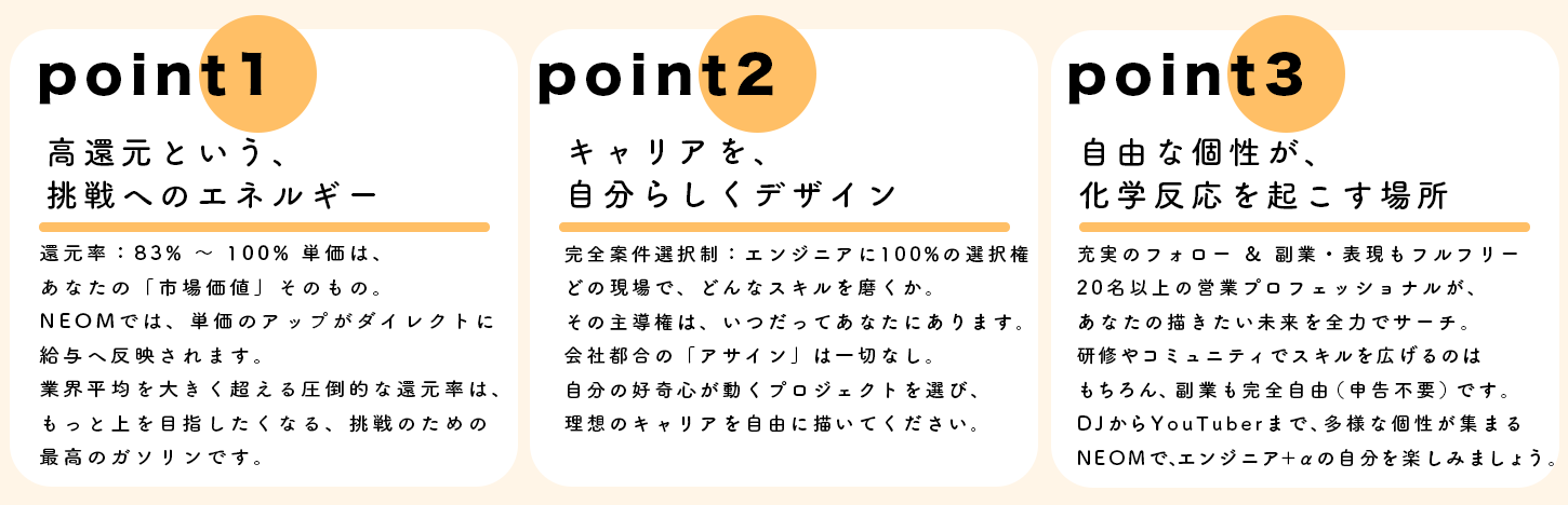 株式会社NEOMが大切にしているのは、未経験からスタートする一人ひとりが、「高還元×案件選択制」という透明な仕組みを通じて、自らの市場価値をポジティブに積み上げていける環境です。